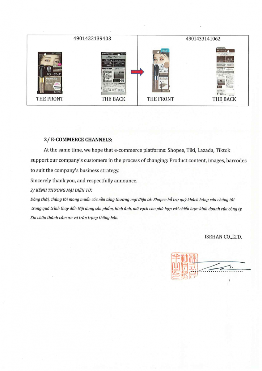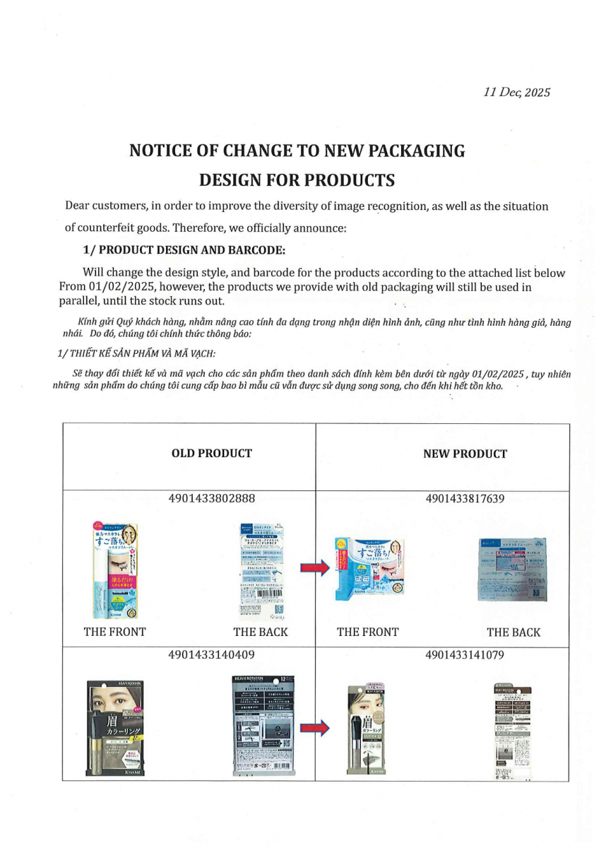 Nhằm nâng cao khả năng nhận diện sản phẩm và phòng chống hàng giả, chúng tôi xin thông báo về việc thay đổi thiết kế bao bì và mã vạch đối với một số sản phẩm theo danh sách đính kèm.